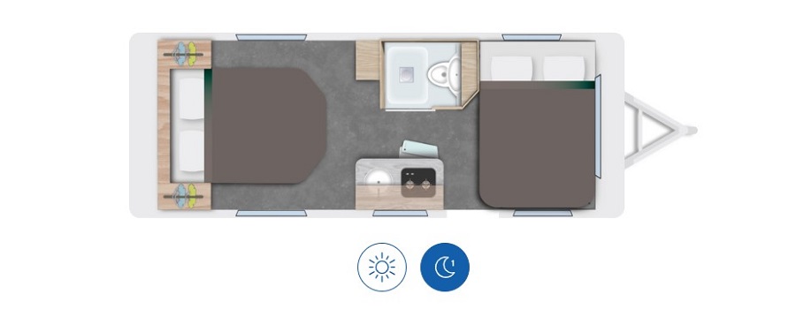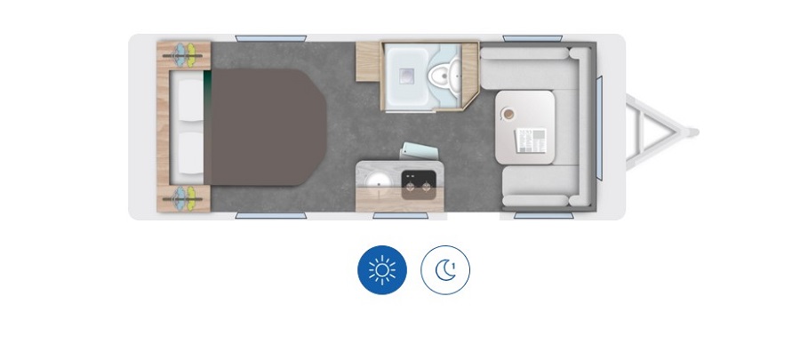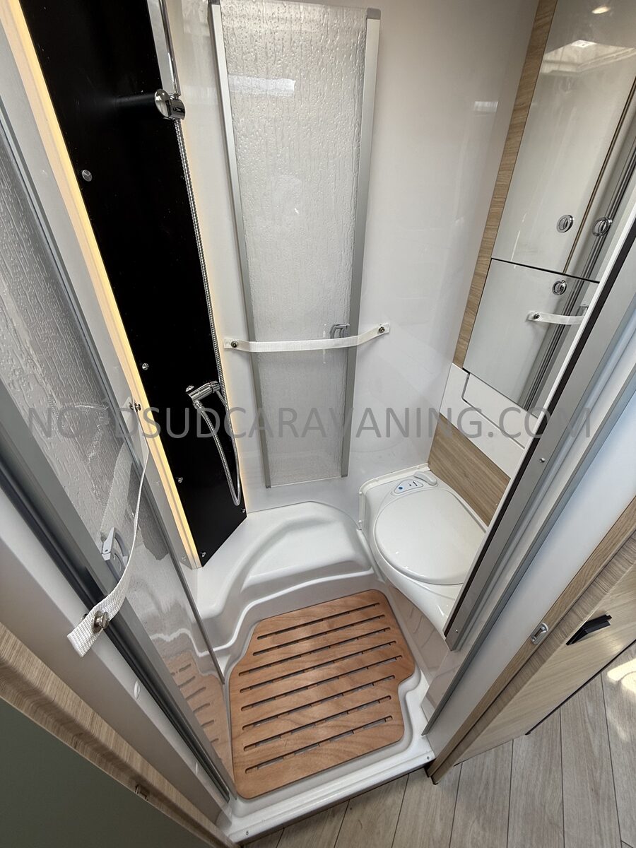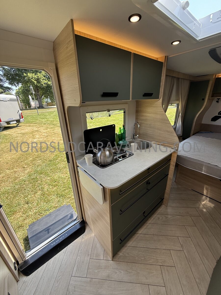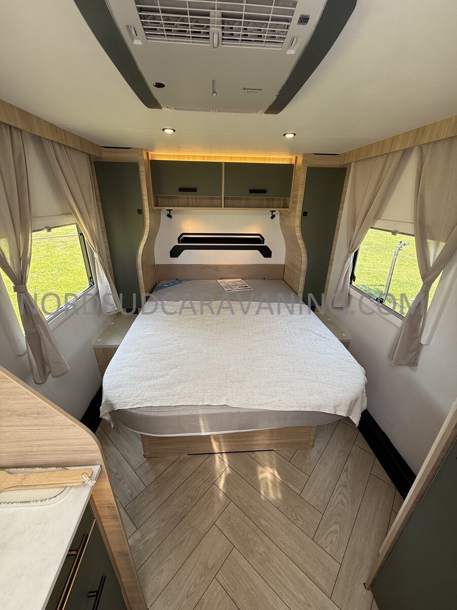 Equipée d’une cuisine avec réchaud 2 feux, cuve évier inox avec couvercle en verre, un grand réfrigérateur à compression 150L XL Freeze, d’un chauffage chauffe-eau gaz, de l’air pulsé, le tout, de série. La soute traversante sous le lit vous apporte un espace de rangement supplémentaire. Sans oublier son coin toilette avec WC, lavabo, douche séparée et ses nombreux rangements astucieux.