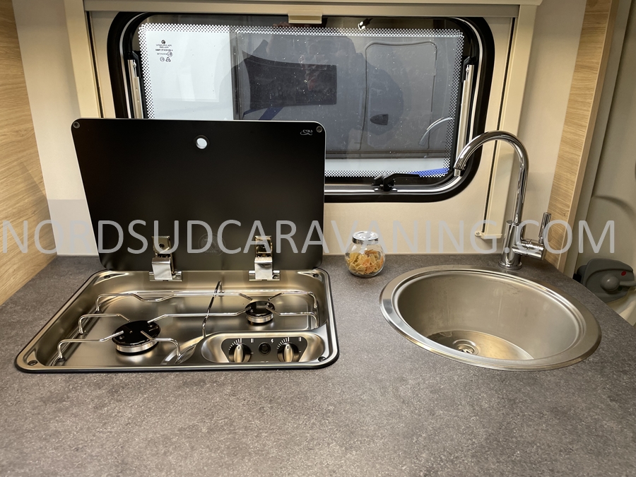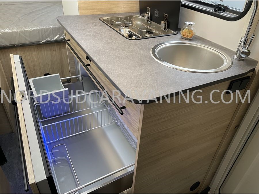 Cette caravane rigide CARAVELAIR ALBA 466 est très agréable à vivre. Très bel espace nuit avec son lit transversal et ses nombreux rangements, vous vous sentirez comme à la maison. Cuisine équipée avec réfrigérateur 150 L, réchaud 2 feux gaz avec couvercle en verre, évier cuve inox. Elle a également un joli coin salle de bain, avec son toilette et son bac à douche.