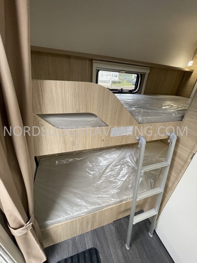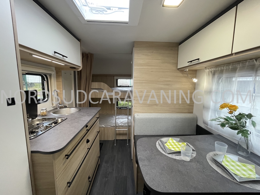 Déplacez-vous facilement à l’intérieur de cette caravane familiale compacte de 6 places. Sur 4,7 m, vous disposez d’un lit fixe 2 places, de lits superposés et d’une dînette transformable en 2 couchages enfants. En plus, un garage avec portillon est intégré, idéal pour ranger vos vélos, de retour de balades.