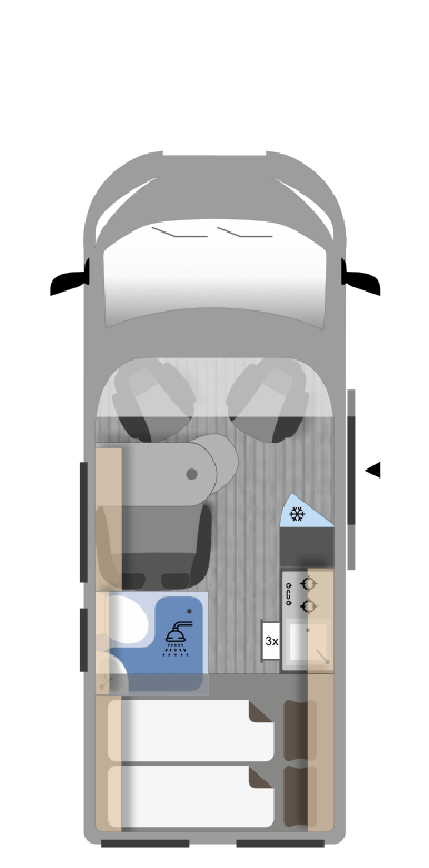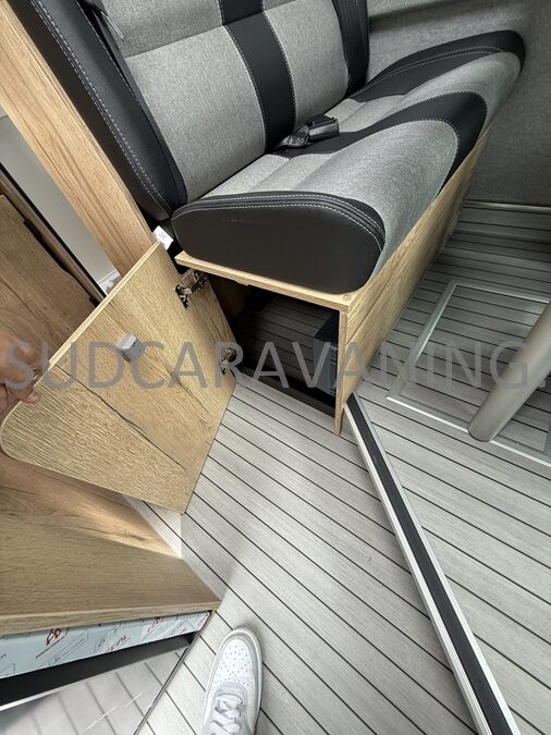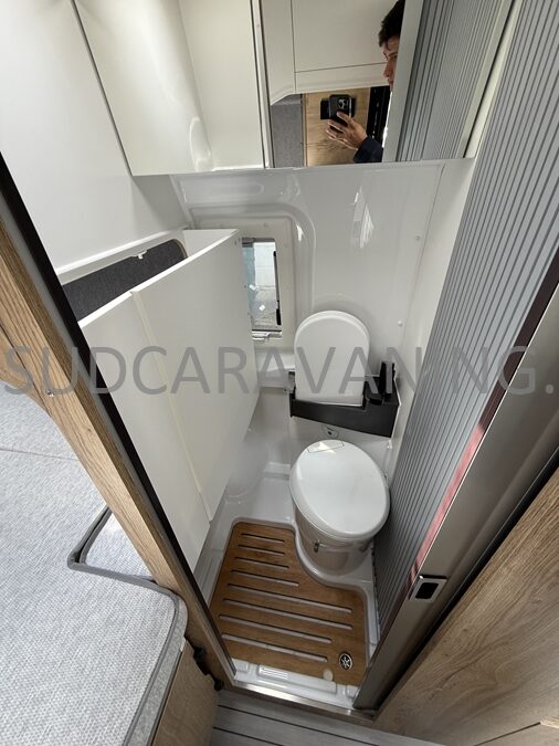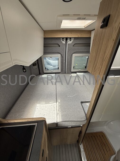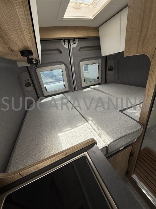 Ce magnifique fourgon de 5.40m avec sa maniabilité maximale, est équipé d’une dinette harmonieuse et lumineuse pour 4 personnes. Sa cuisine latérale fonctionnelle est dotée d’un réchaud 2 feux, d’un évier inox, de couvercles en verre, d’un réfrigérateur à double ouverture et d’un plan de travail haute résistance. En face, sa salle d’eau avec WC à cassette, lavabo escamotable, miroir et un caillebotis vous apportera une sensation de bien-être. A l’arrière, vous y retrouverez un lit transversal pour des nuits agréables et confortables. Sans oublier ses nombreux rangements astucieux.