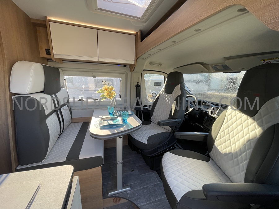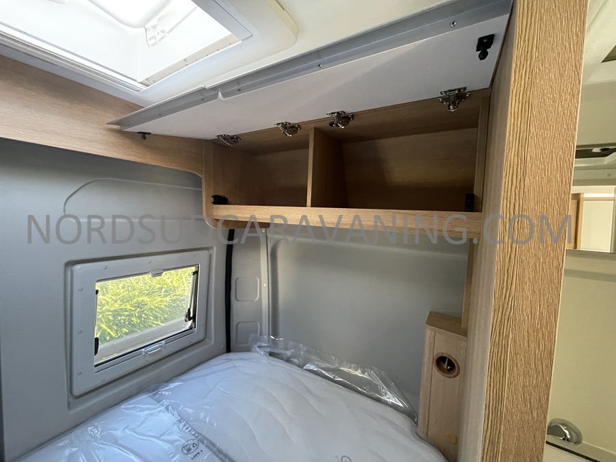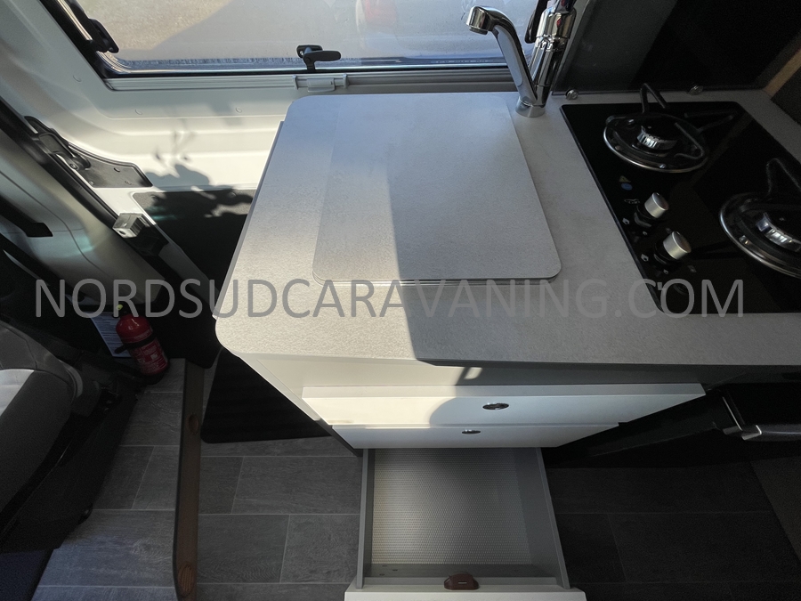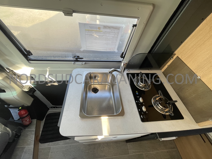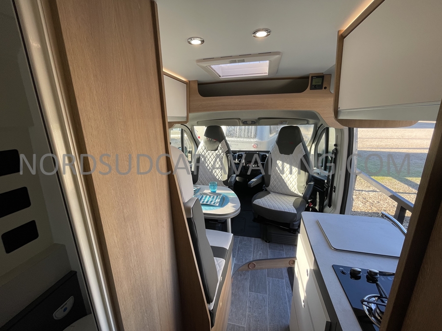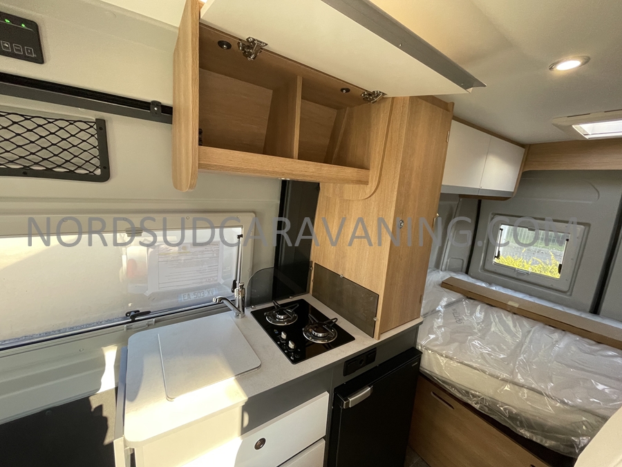 Sa dinette agréable et lumineuse se transforme en couchage d’appoint. Sa cuisine latérale pratique et fonctionnelle est équipée d’un réchaud 2 feux, évier et plan de travail rabattable. En face, une salle d’eau compacte tout-en-un qui ne manque de rien (Lavabo, miroir, WC, Douche). A l’arrière, c’est un couchage transversal confortable et agréable sur soute qui est proposé, vous permettant de ranger vos vélos, de retour de balades. Sans oublier ses nombreux rangements astucieux !