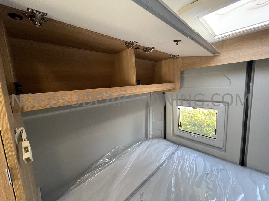Un maximum d’espace avec un lit transversal et dinette.