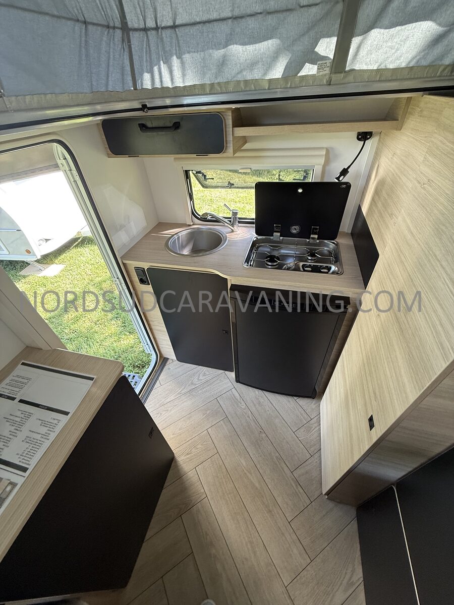 Elle possède une dînette transformable en un grand couchage 2 personnes, une cuisine équipée avec évier cuve inox, plaque 2 feux gaz et réfrigérateur, un coin toilette avec bac à douche, WC à cassette, ainsi que de nombreux rangements ! Autrement dit, une caravane toute équipée dans des dimensions ultra compacte sans négliger le confort !