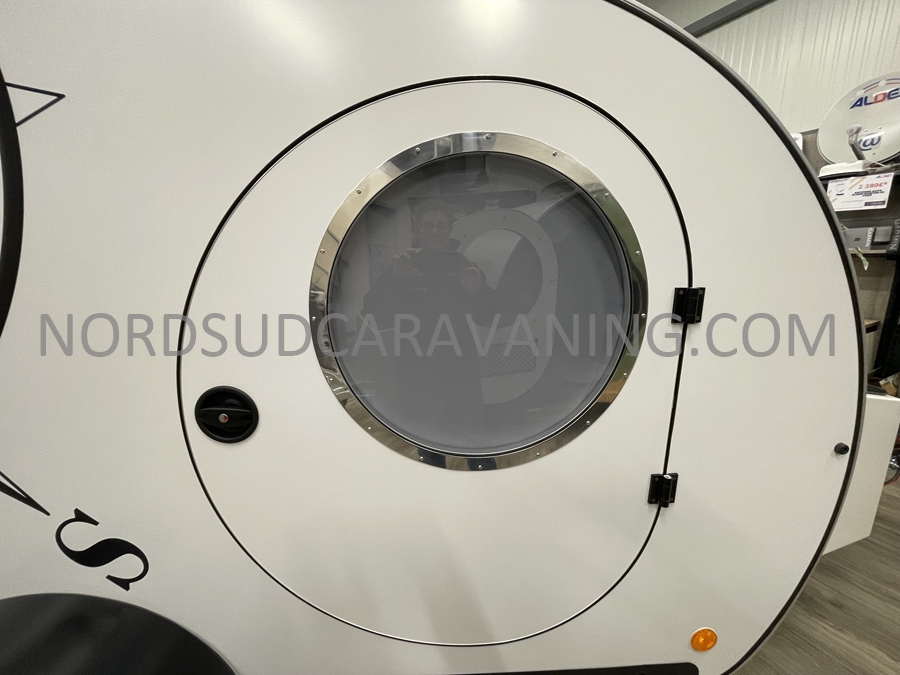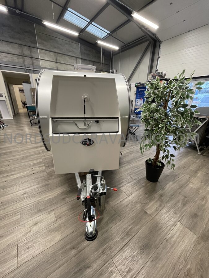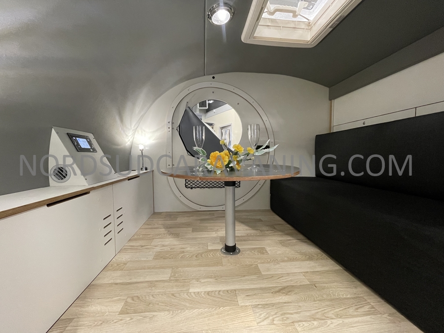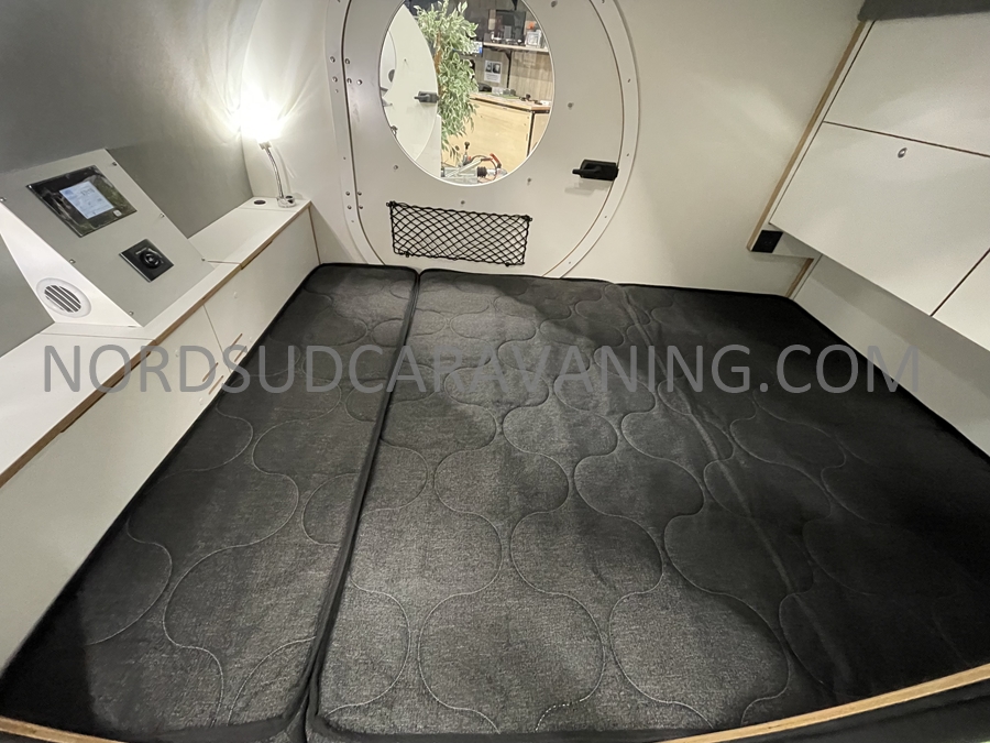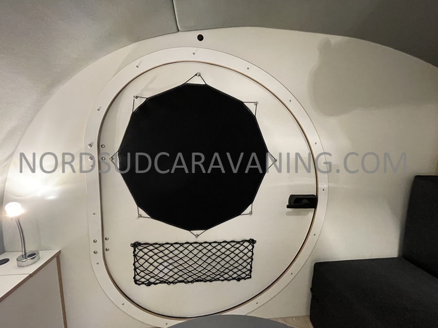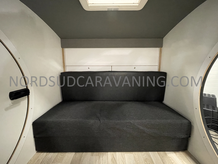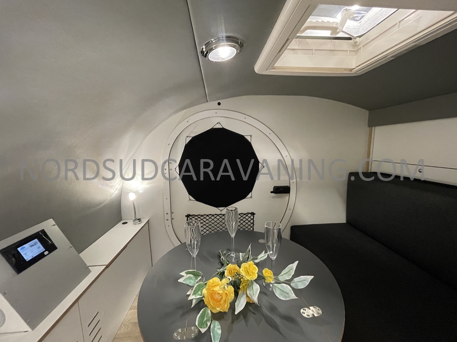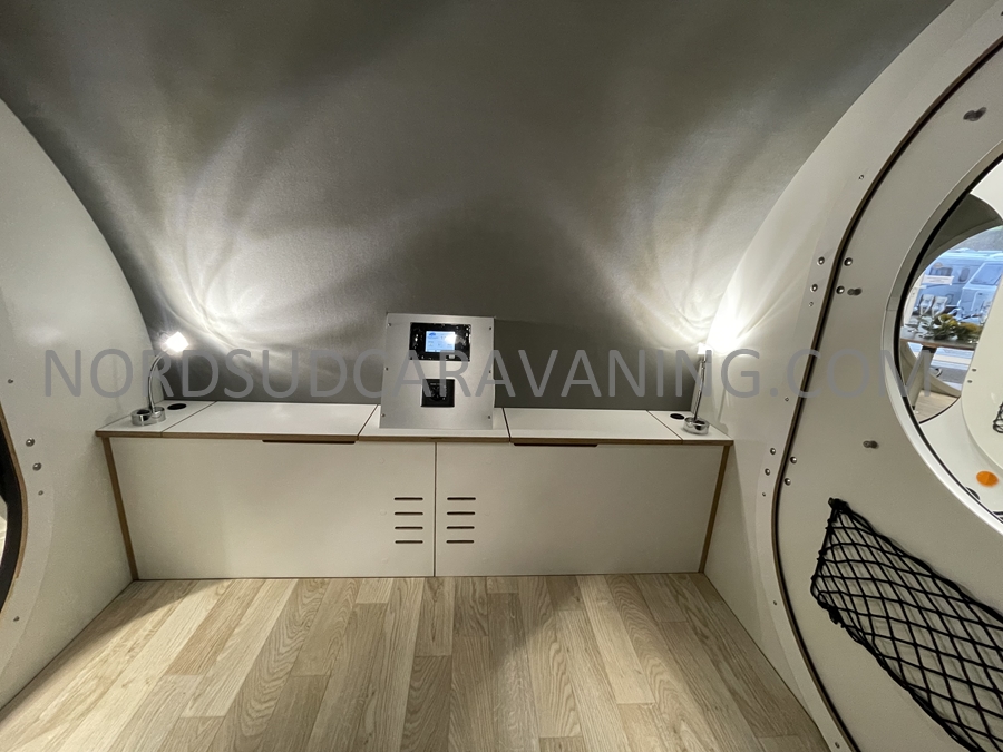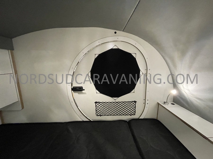 Conçue pour être légère et aérodynamique, elle offre un espace de couchage pour deux personnes et une petite cuisine extérieure accessible par une porte arrière.