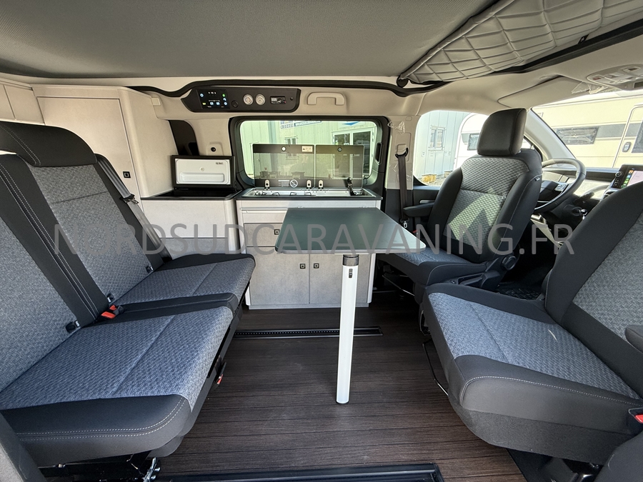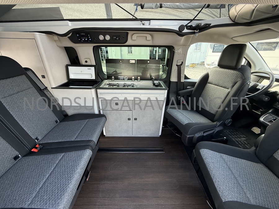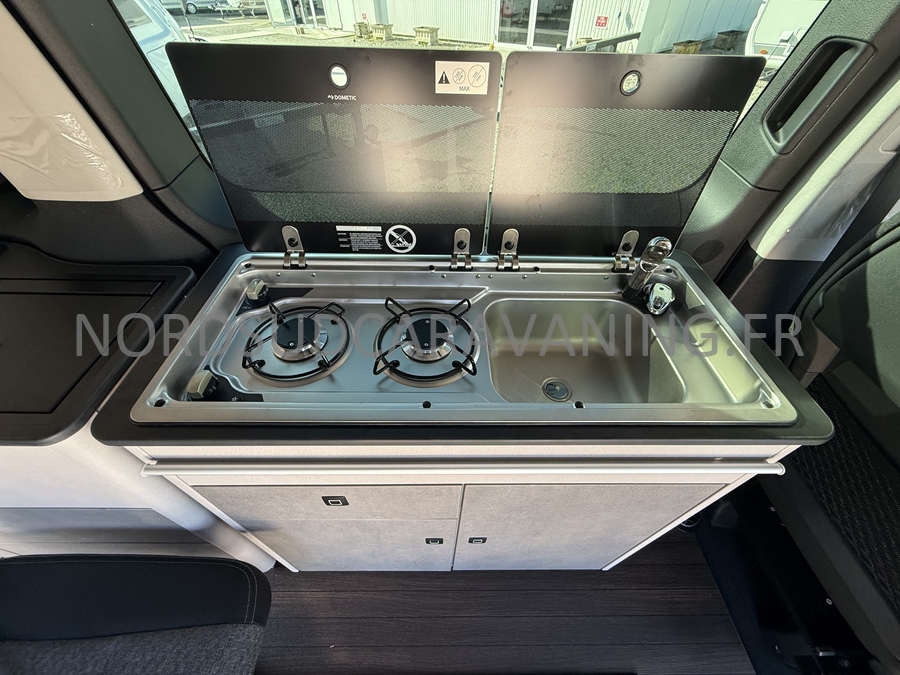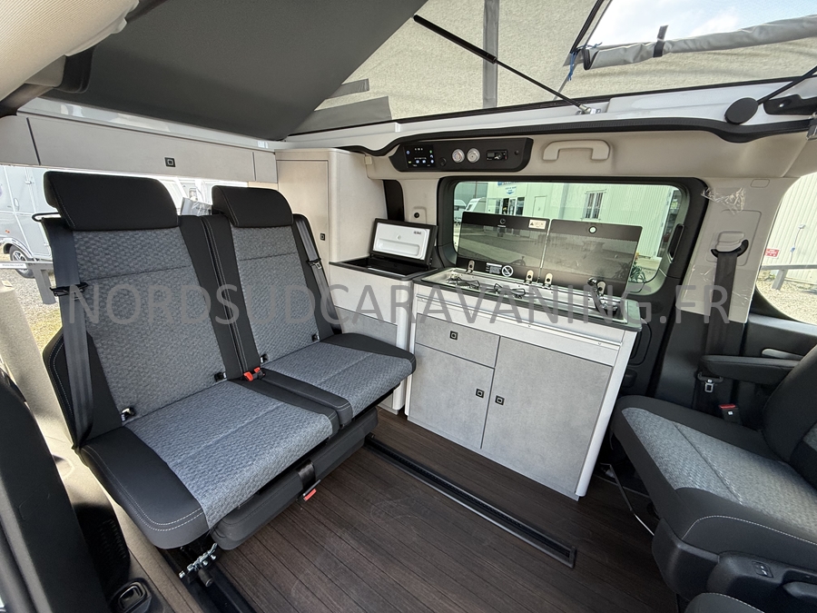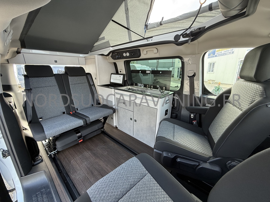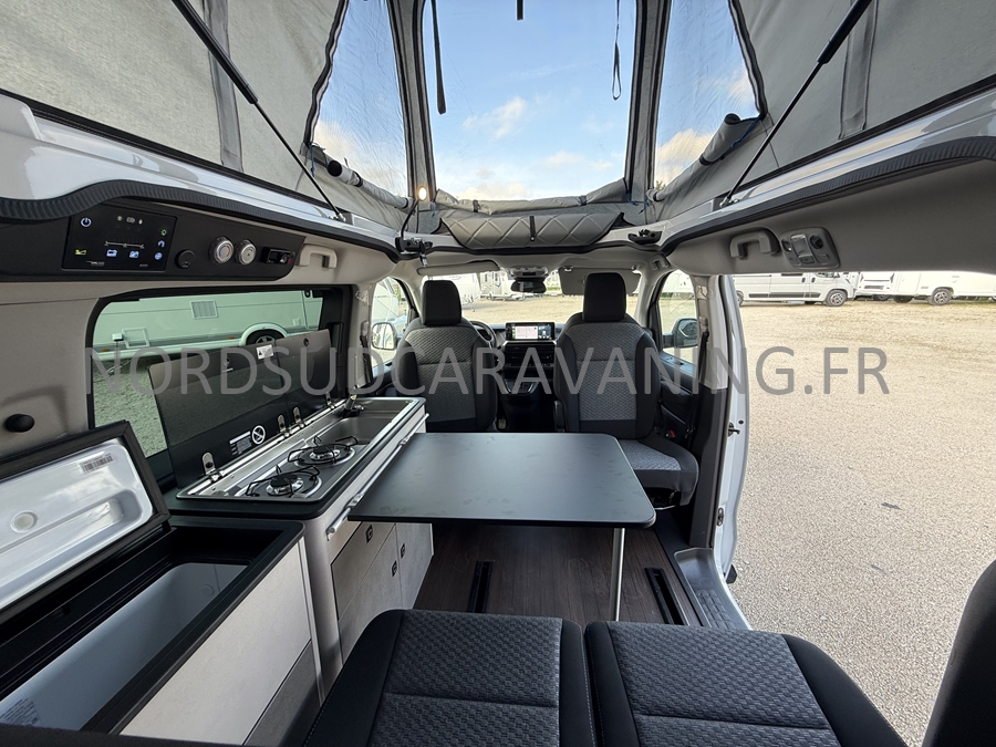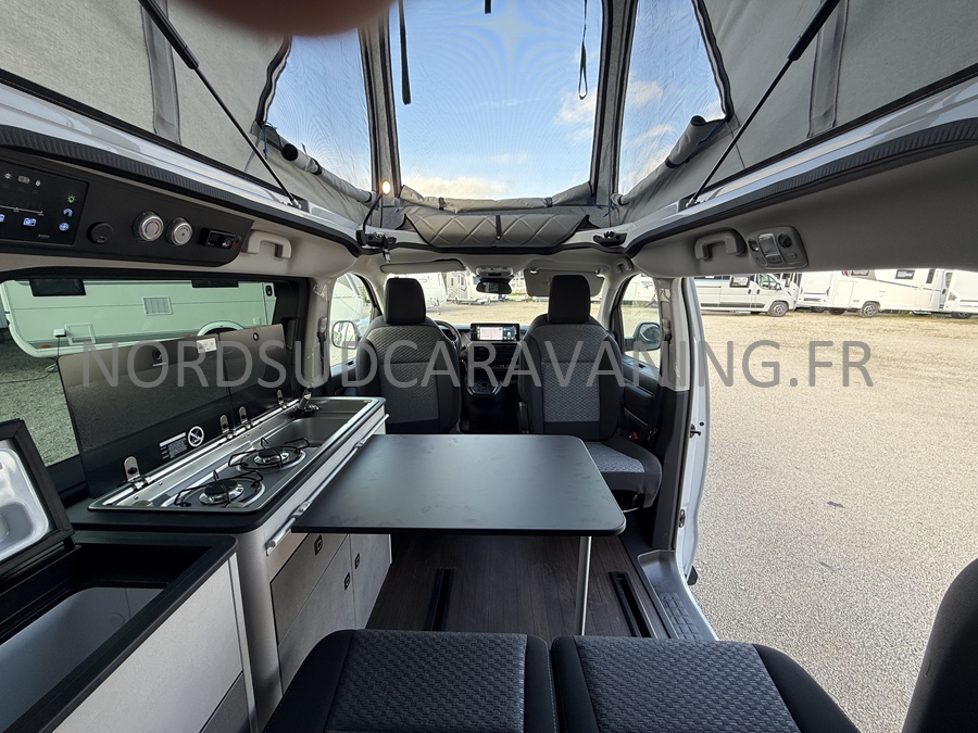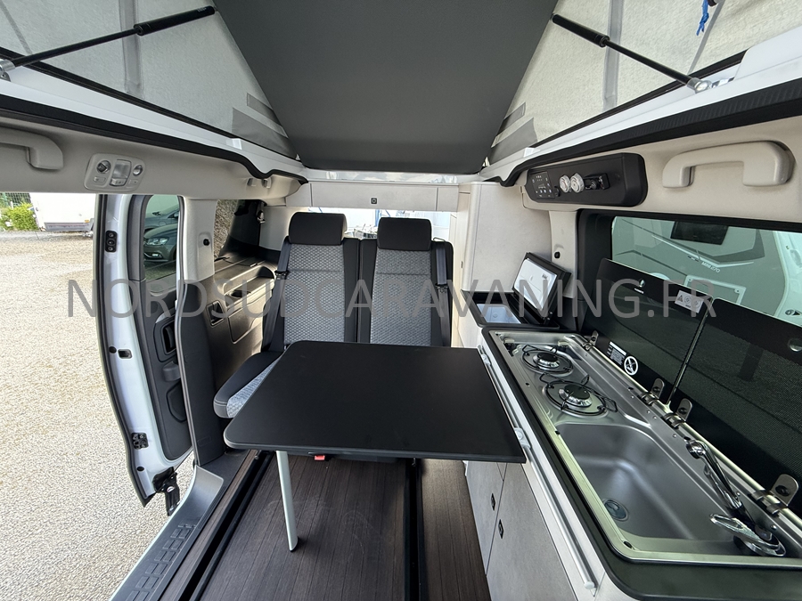 un VÉHICULE DE LOISIRS pour le week-end avec sa possibilité de couchage pour 4 personnes : la banquette dépliante + le toit relevable, et dispose d'un bloc cuisine amovible