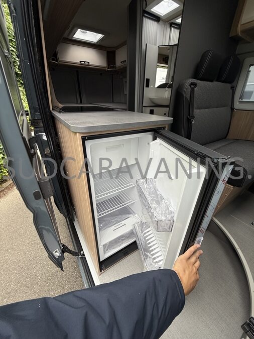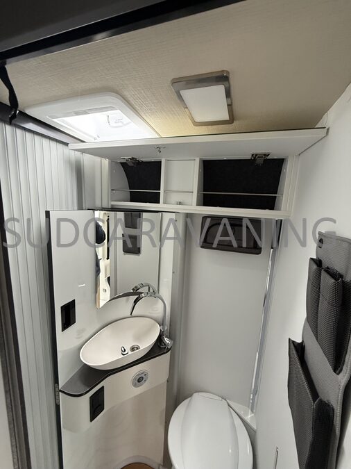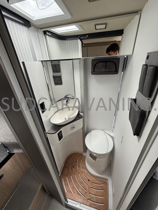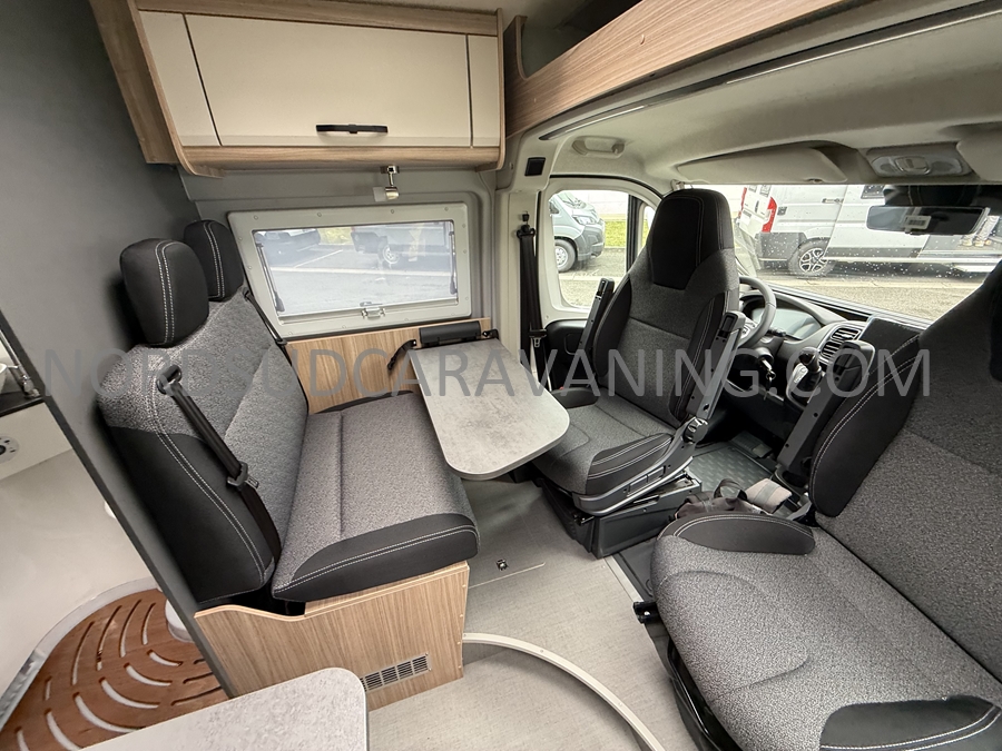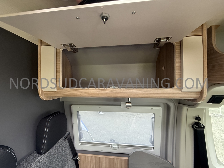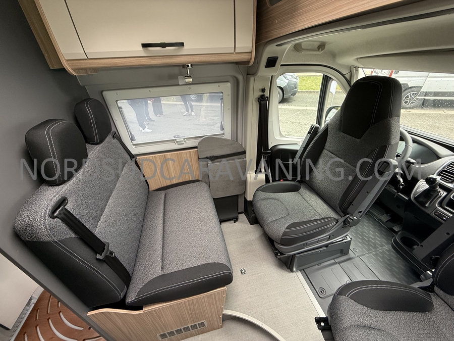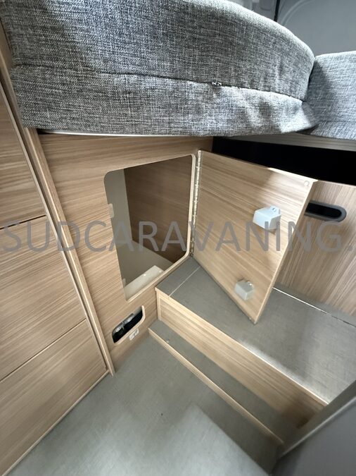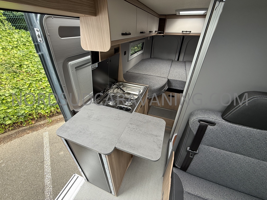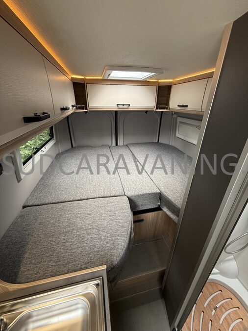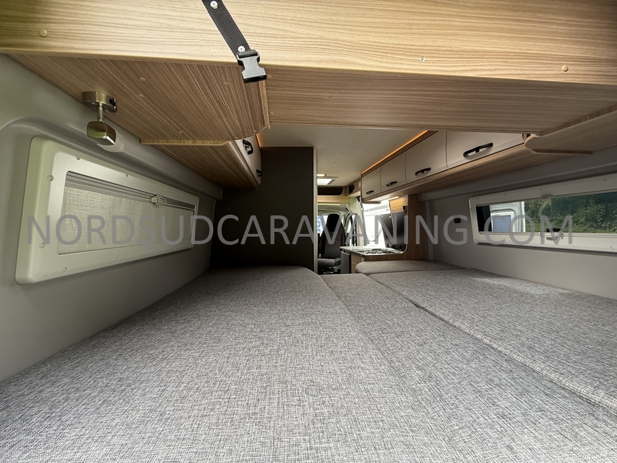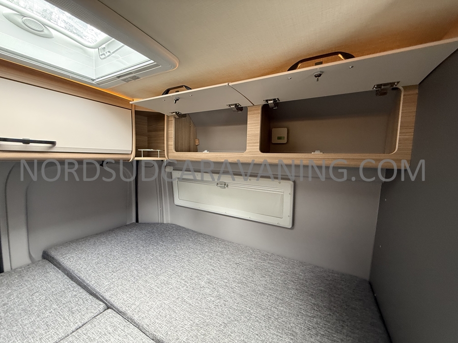 Sa dinette agréable et lumineuse pour une ambiance conviviale. Sa cuisine latérale, pratique et fonctionnelle est équipée d’un réchaud 2 feux, évier et plan de travail rabattable. En face, une salle d'eau avec WC, lavabo, et une douche spacieuse. A l’arrière, ce sont de lits jumeaux, pour plus d’espace. Sans oublier ses nombreux rangements astucieux !